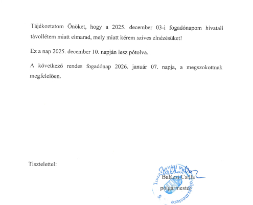 Vasvári Tisza2025-12-02 10:38:562025-12-02 10:38:582025.12.03 -i Polgármesteri fogadónap hivatali távollét miatt elmarad