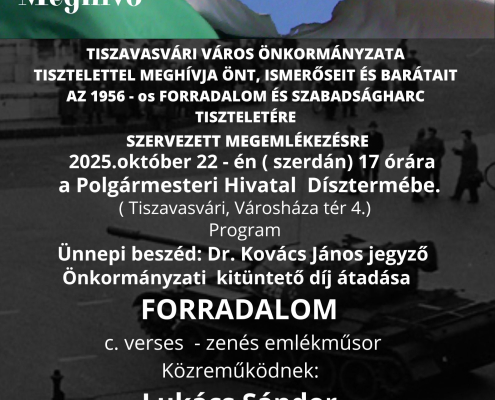 Vasvári Tisza2025-10-14 08:27:242025-10-14 08:27:26Meghívó: Az 1956 -os Forradalom és Szabadságharc tiszteletéreTiszavasvári Polgármesteri Hivatal