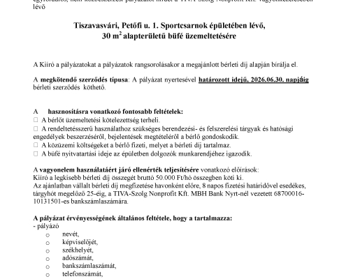 Vasvári Tisza2025-10-22 16:53:032025-10-22 19:19:20Pályázati Felhívás Büfé Üzemeltetésére