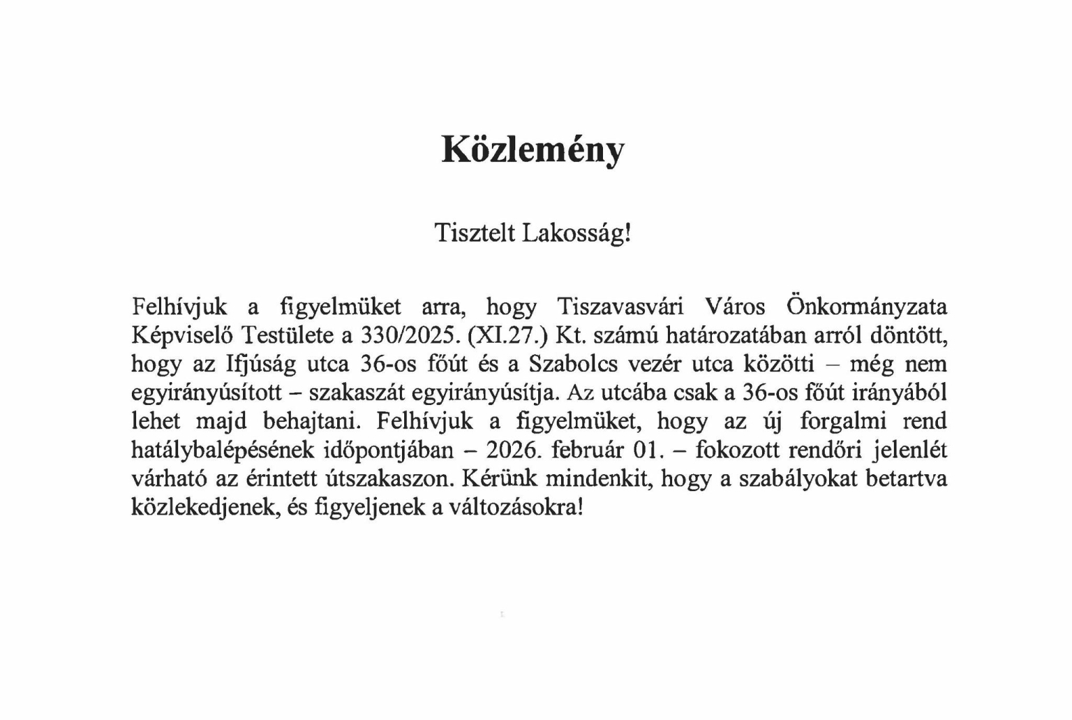 Közlemény – Ifjúság utca egyirányúsításáról