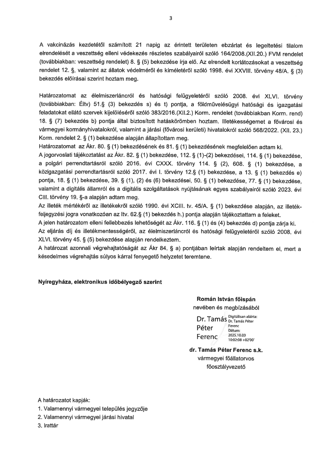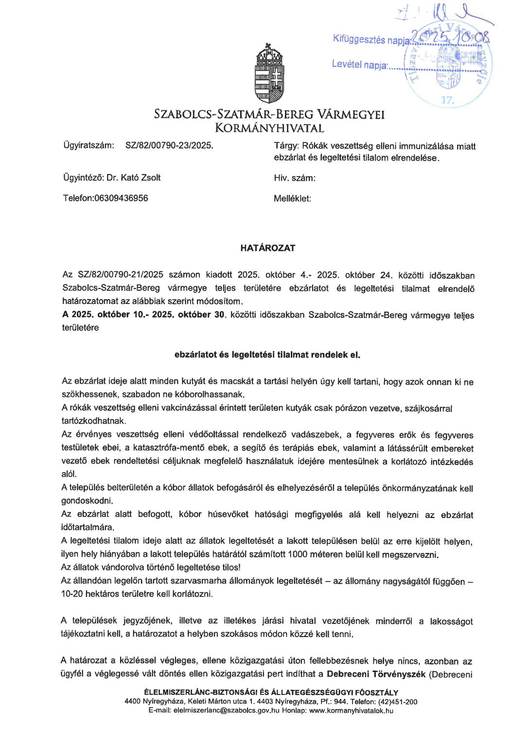Rókák veszettség elleni immunizálása miatt ebzárlat és legeltetési tilalom elrendelése.