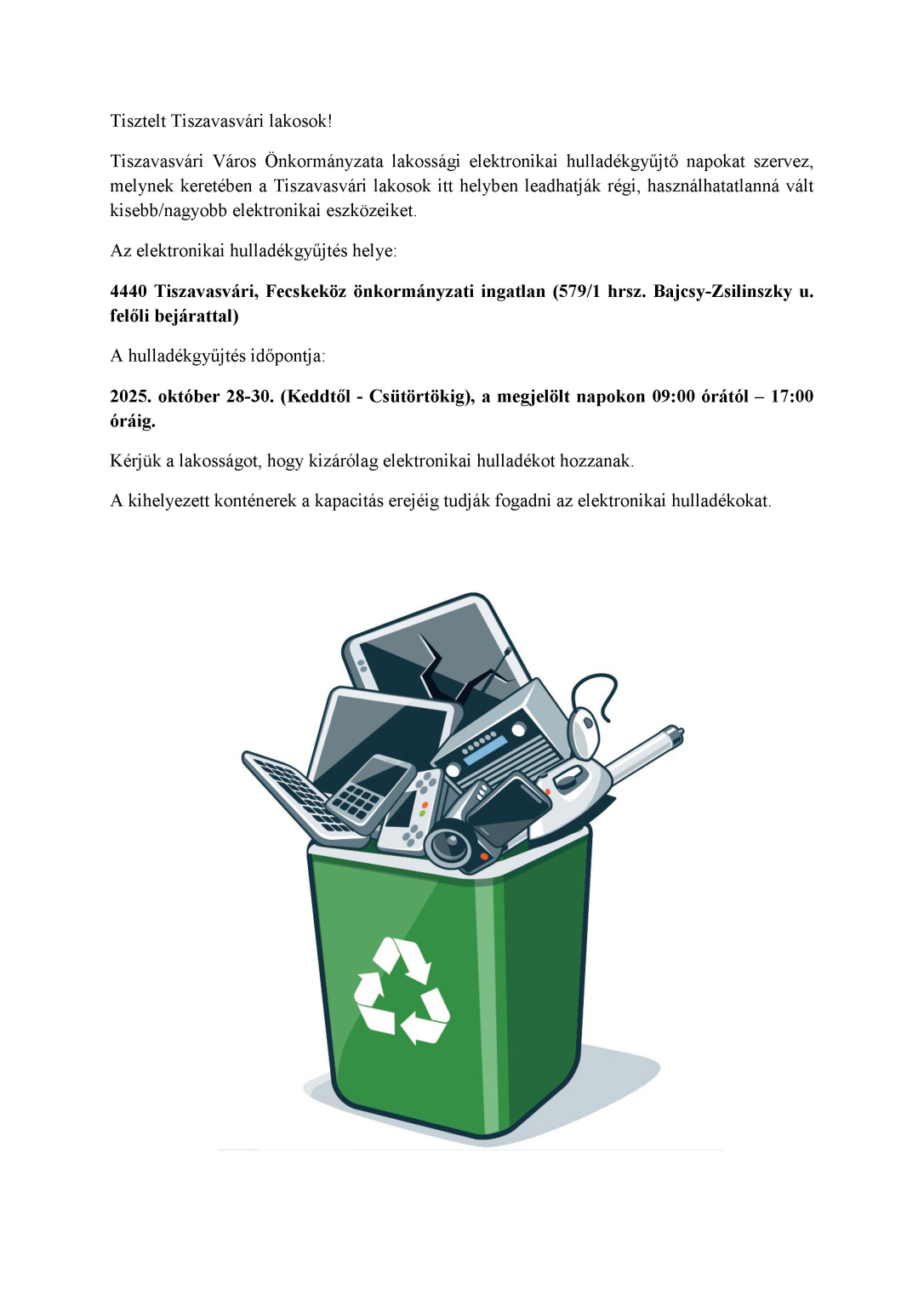 2025.10.06./Szerző: Vasvári TiszaTiszavasvári Város Önkormányzata lakossági elektronikai hulladékgyűjtő napokat szervez