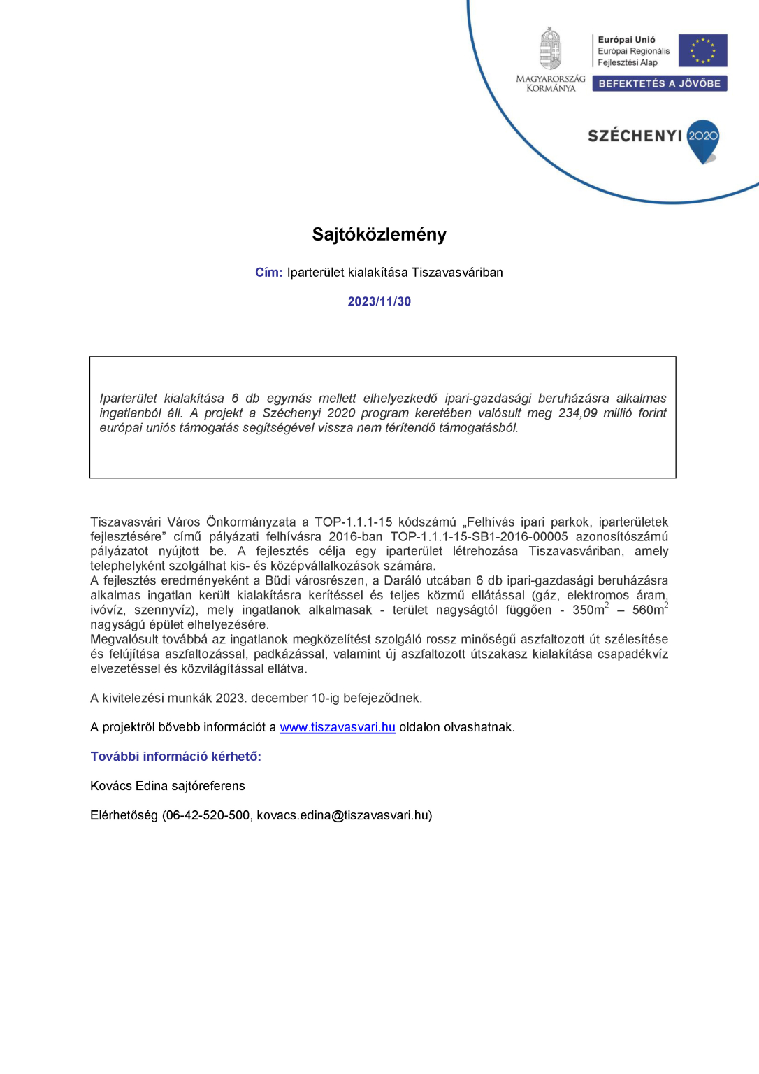 A projekt címe: „Iparterület kialakítása Tiszavasváriban”