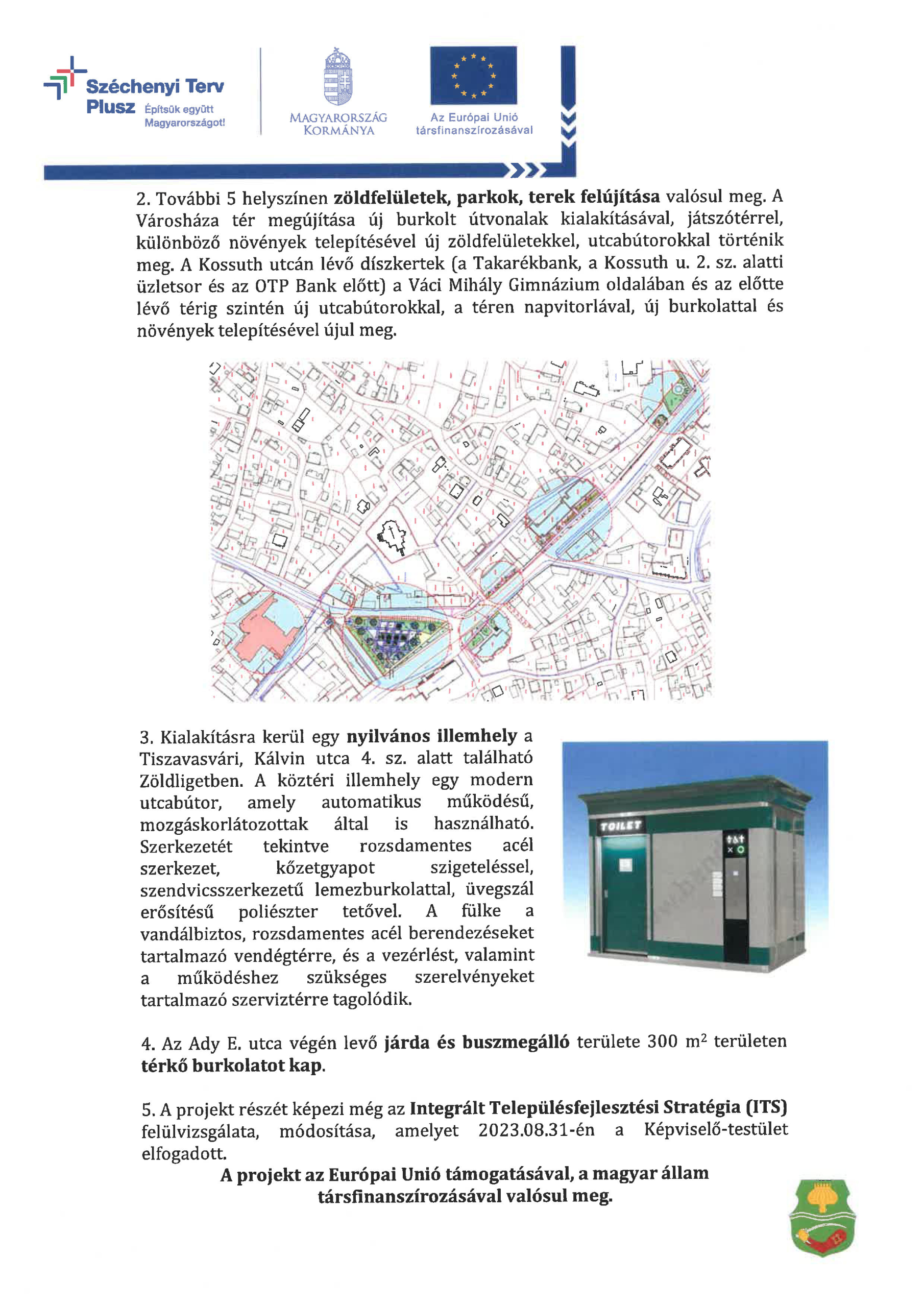 - További 5 helyszínen zöldfelületek, parkok, terek felújítása valósult meg. A Városháza tér megújítása új burkolt útvonalak kialakításával, játszótérrel, különböző növények telepítésével új zöldfelületekkel, utcabútorokkal történt meg. A Kossuth utcán lévő díszkertek (a Takarékbank, a Kossuth u. 2. sz. alatti üzletsor és az OTP Bank előtt) a Váci Mihály Gimnázium oldalában és az előtte lévő térig szintén új utcabútorokkal, a téren napvitorlával, új burkolattal és növények telepítésével újult meg.