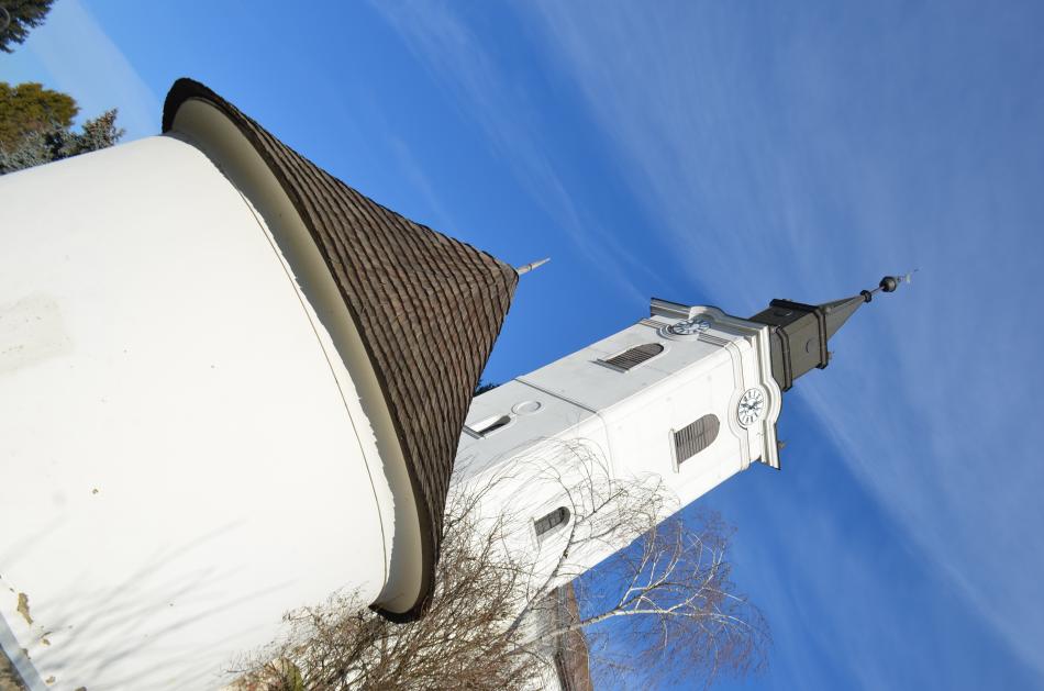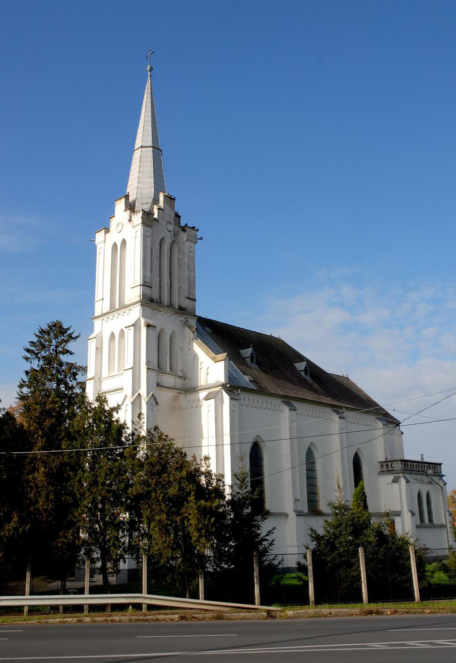 A torony sarkait támpillérek erősítik, tetejét bádoggal fedett gúlasisak zárja. A hajó déli oldalán három csúcsíves ablak sorakozik, köztük támpillérekkel tagolt falszakaszokkal. Az épület gótizáló koronapárkánya tovább erősíti a historizáló megjelenést. Ehhez az oldalhoz kapcsolódik az oratórium, amelyet két csúcsíves ablak világít meg, felette áttört kőkorlát fut végig.